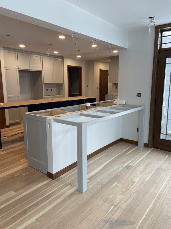 By changing the layout of the kitchen, the clients could have an island that makes gathering and socializing easy. Barn doors were added to the opening of the sunroom to give the option to close off the space as needed. The hardwood allows light to bounce off of it, making the room feel bigger.